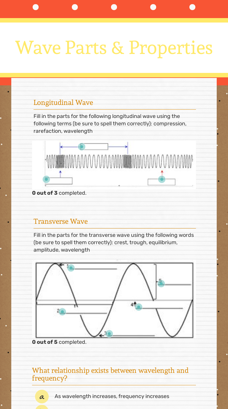 Parts of a Wave interactive worksheet Parts of a Wave Label the parts of a transverse wave. ID: 3275013. Language: English School subject: Science Grade/level: 4. Age: 9-11. Main content: Waves