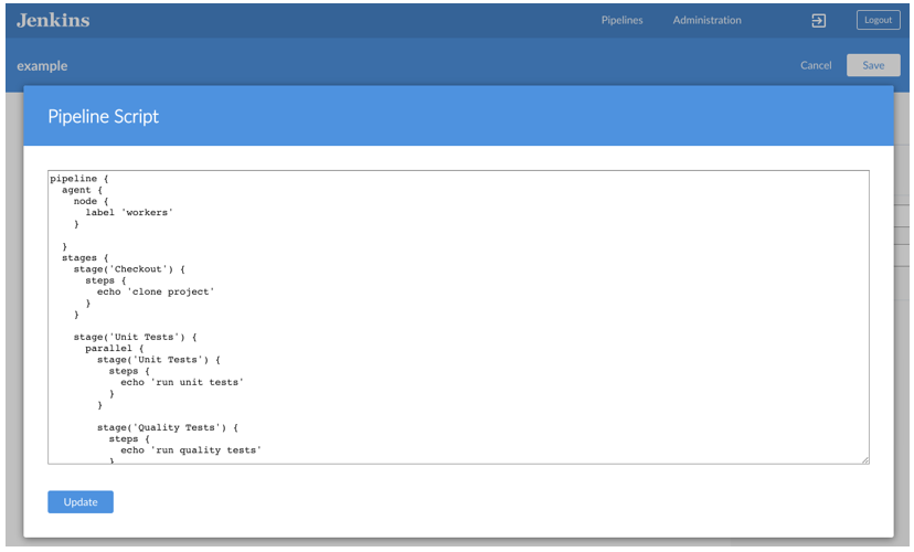 Pipeline Syntax - Jenkins Execute the Pipeline, or stage, with the given container which will be dynamically provisioned on a node pre-configured to accept Docker-based Pipelines, or on a node matching the optionally defined label parameter. docker also optionally accepts an args parameter which may contain arguments to pass directly to a docker run invocation, and an … groovy - Set node label in Jenkins pipeline - Stack Overflow Set node label in Jenkins pipeline Ask Question Asked 6 years, 2 months ago Modified 5 years, 4 months ago Viewed 36k times Part of CI/CD Collective 12 Is it possible to set a label instead of a name for nodes Groovy? We want to define labels outside the script to easily access them from the Jenkins Dashboard. Idea: Instead of: Groovy Script